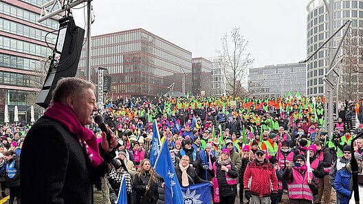 Die Mitglieder der dbb Fachgewerkschaften sorgten für Rückenwind: nach einem Demonstrationszug von den Landungsbrücken zur HafenCity gab es Kundgebung, bei der unter anderen dbb Tarifvorstand Andreas Hemsing und Kai Tellkamp zu den aus allen betroffenen Berufsgruppen zusammengekommen Beschäftigten des öffentlichen Dienstes sprachen.