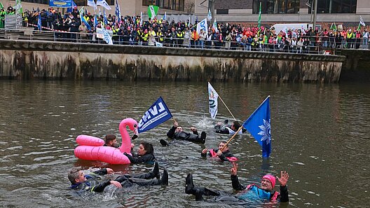 Mit einer symbolträchtigen Aktion wurden die Warnung und die Forderungen, zu denen eine Einkommensanpassung von 7 Prozent gehört, untermauert: Beschäftigte verschiedener Berufsgruppen stiegen in die eiskalte Elbe. Wir wollen nämlich nicht, dass der gesamte öffentliche Dienst absäuft.
