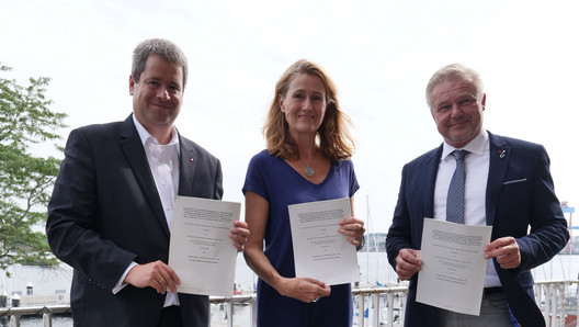 DGB-Abteilungsleiter Olaf Schwede, Finanzministerin Dr. Silke Schneider und dbb Landesbundvorsitzender Kai Tellkamp haben die Vereinbarung unterzeichnet